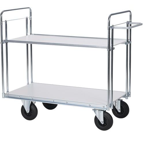 Carrello per carichi pesanti con 2 ripiani, adatto per il trasporto a lunga distanza. Ripiani e maniglie di spinta facilmente regolabili in altezza. Quattro montanti robusti su ciascuna estremità del carrello. Dotato di due rotelle fisse e due rotelle girevoli.