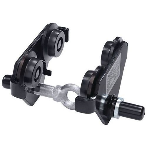 Carrello porta-paranco manuale, montaggio agevolato che consente di sospendere un paranco tramite ganci di sospensione. Rotelle di scorrimento ruotati montati su cuscinetti a sfere, incapsulati e a lubrificazione permanente. Piastre laterali con dispositivo di sicurezza anti-ribaltamento e anticaduta. Adattamento continuo a diverse larghezze della trave.