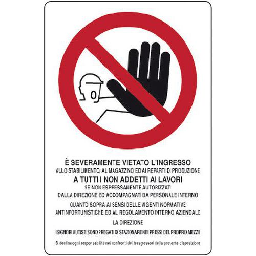 Cartello di divieto - è severamente vietato l'ingresso ai non addetti al lavoro + legge