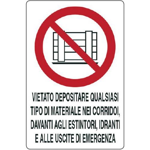 Cartello di divieto - vietato depositare qualsiasi tipo di materiale nei corridoi e davanti alle uscite di eme