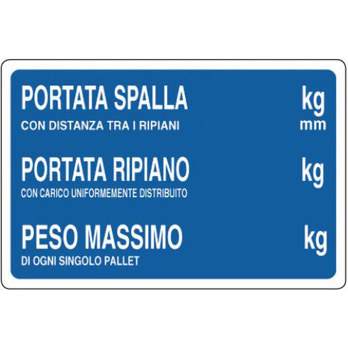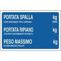 Cartello di indicazione - Portata scaffalatura (spalla, ripiano, peso massimo)
