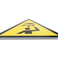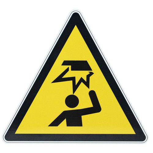 Cartello di segnalazione con pittogramma comprensibile da tutti, che avverte del pericolo causato dagli oggetti posizionati in altezza e dagli angoli sporgenti che rappresentano rischi per la testa.