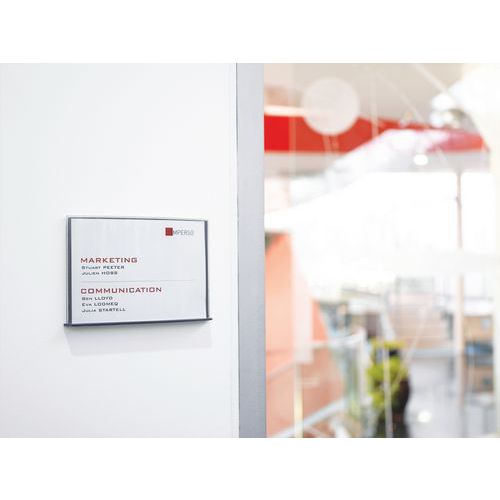 1 targhetta, 3 dispositivi di fissaggio: da appoggiare, da parete e a bandiera.
