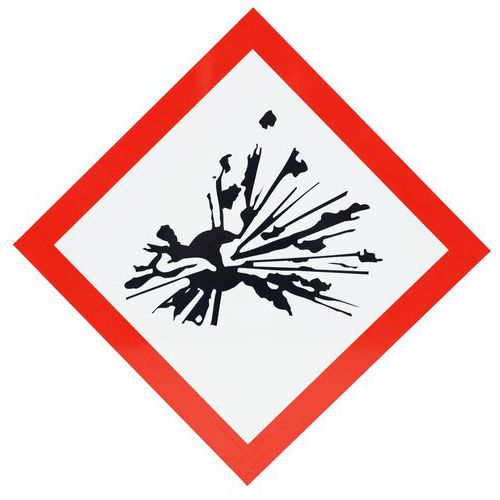 - Cartello con pittogramma Sostanze esplosive che consente di indicare la presenza di prodotti che possono esplodere a contatto con una fiamma, con elettricità statica o in seguito a un urto.