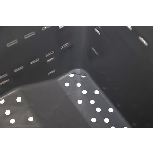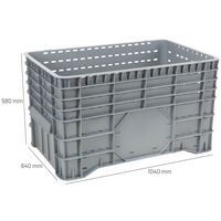 | Descrizione | Cassa-pallet impilabile, Capacità: 300 L, Carico max.: 120 kg, Altezza totale: 580 mm |