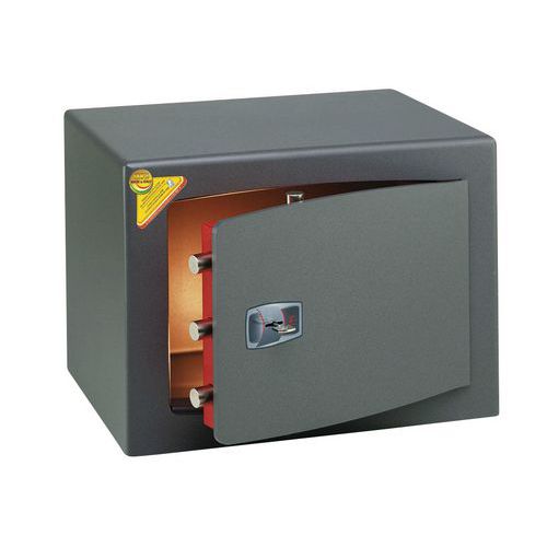 La serratura a chiave a doppia mappa, composta da 8 nottolini asimmetrici e indipendenti, garantisce una protezione efficace degli oggetti di valore. Chiavistelli girevoli in acciaio nichelato diametro 22 mm protetti da una piastra in acciaio al manganese spessa 3 mm disposta obliquamente per una resistenza ottimale alla perforazione. Le solide saldature interne e le chiavi speciali garantiscono una resistenza superiore contro i tentativi di effrazione.
