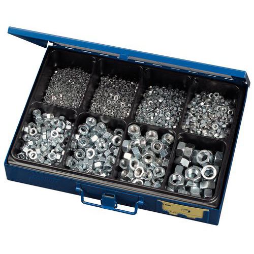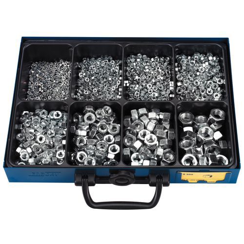 | Descrizione | Cassetta di dadi esagonali in acciaio, Materiale: Acciaio, N. di pezzi: 2200, Modello: Set |