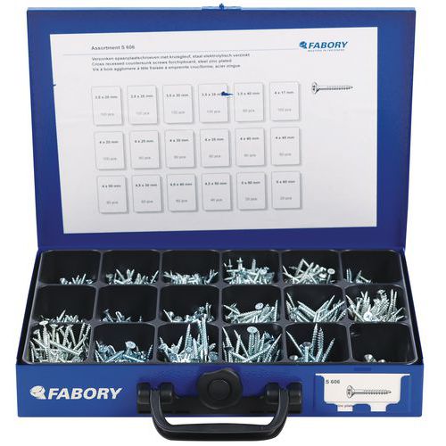 | Descrizione | Cassetta viti con impronta a croce Pozidriv® testa svasata 1225 pezzi, Materiale: Acciaio |