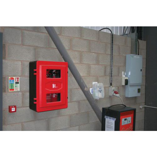| Descrizione | Cassetta per 2 estintori, Materiale: Polietilene ad alta densità, Colore: Rosso/nero, Per estintore |