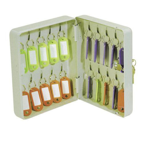 Cassetta per chiavi. Per l'organizzazione con ganci fissi. Lamiera d'acciaio imbutita 0,8 mm, con laccatura epossidica grigia chiara. Bordi arrotondati con portachiavi colorati e barre di aggancio fisse. Fissaggio a muro. Consegnata con materiale per il fissaggio. Chiusura a chiave. Serratura di sicurezza con 2 chiavi.
