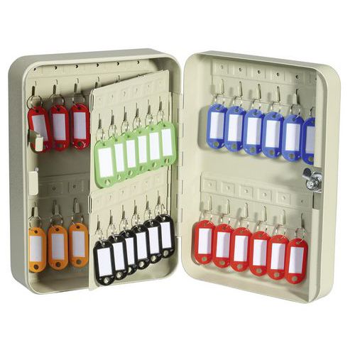 Cassetta per chiavi. Per l'organizzazione con ganci fissi. Lamiera d'acciaio imbutita 0,8 mm, con laccatura epossidica grigia chiara. Bordi arrotondati con portachiavi colorati e barre di aggancio fisse. Fissaggio a muro. Consegnata con materiale per il fissaggio. Chiusura a chiave. Serratura di sicurezza con 2 chiavi.