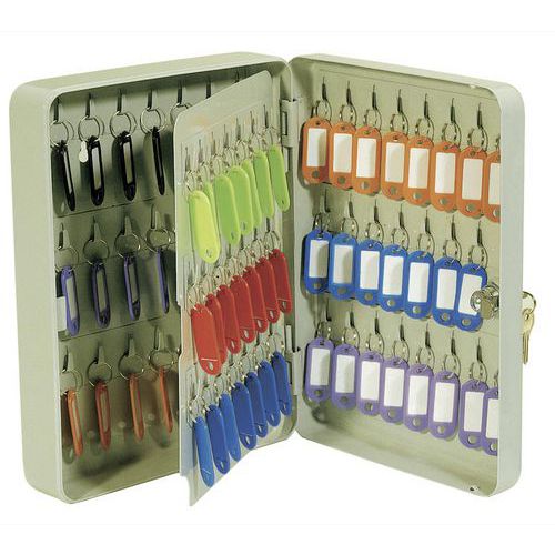 Cassetta per chiavi. Per l'organizzazione con ganci fissi. Lamiera d'acciaio imbutita 0,8 mm, con laccatura epossidica grigia chiara. Bordi arrotondati con portachiavi colorati e barre di aggancio fisse. Fissaggio a muro. Consegnata con materiale per il fissaggio. Chiusura a chiave. Serratura di sicurezza con 2 chiavi.