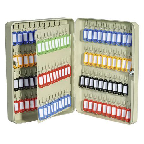 Cassetta per chiavi. Per l'organizzazione con ganci fissi. Lamiera d'acciaio imbutita 0,8 mm, con laccatura epossidica grigia chiara. Bordi arrotondati con portachiavi colorati e barre di aggancio fisse. Fissaggio a muro. Consegnata con materiale per il fissaggio. Chiusura a chiave. Serratura di sicurezza con 2 chiavi.