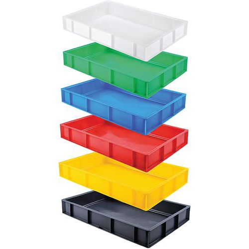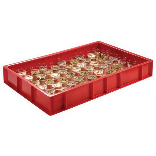 Cassetta piena 600x400. Per catering, ristoranti: cassetta di stoccaggio per materie prime. Impilabile con e senza coperchio, ottima capacità di impilaggio in altezza. Fondo piatto senza zone di ristagno, pulizia facile.