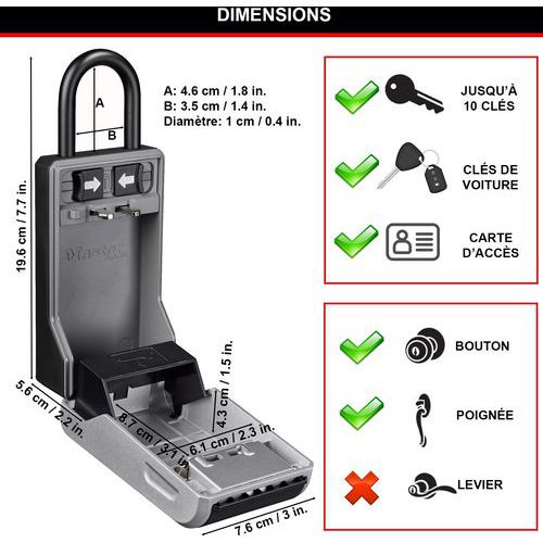 - Combinazione programmabile a 4 cifre con rotelle grandi (fino a 10.000 codici disponibili).