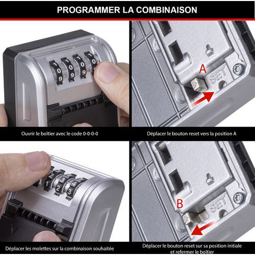 - Combinazione programmabile a 4 cifre con rotelle grandi (fino a 1000 codici disponibili).