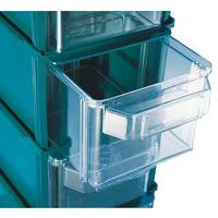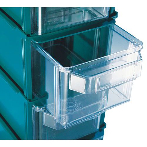 Impilabile, assemblabile, autoportante. Contenitore con cassetti trasparenti in plastica. Pareti laterali fissabili grazie a un sistema di aggancio. La parte superiore può essere chiusa con un coperchio.