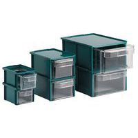 Impilabile, assemblabile, autoportante. Contenitore con cassetti trasparenti in plastica. Pareti laterali fissabili grazie a un sistema di aggancio. La parte superiore può essere chiusa con un coperchio.