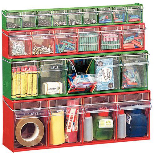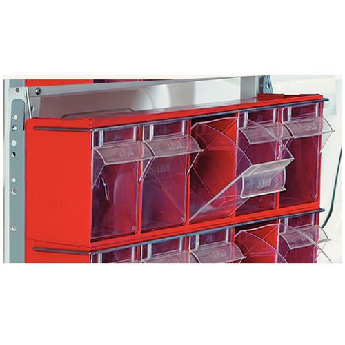 Ideale per sistemare materiali di piccole dimensioni. Con contenitori ribaltabili e rimovibili trasparenti. Le cassettiere sono facilmente componibili a incastro. Ordinare a parte una barra di sicurezza per evitare la caduta dei contenitori.