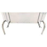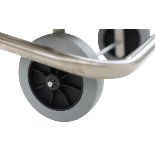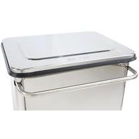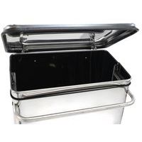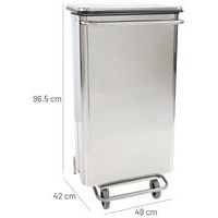 Pattumiera con angolo di apertura del coperchio superiore a 80°. Lato anteriore rimovibile per facilitare l'uscita del sacco. Chiusura del lato anteriore e fissaggio tramite banda elastica. Due ruote in gomma per una migliore manovrabilità. Pedale ampio per utilizzo conforme al protocollo HACCP.
