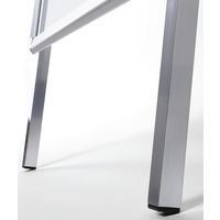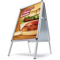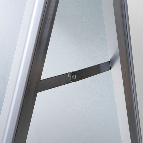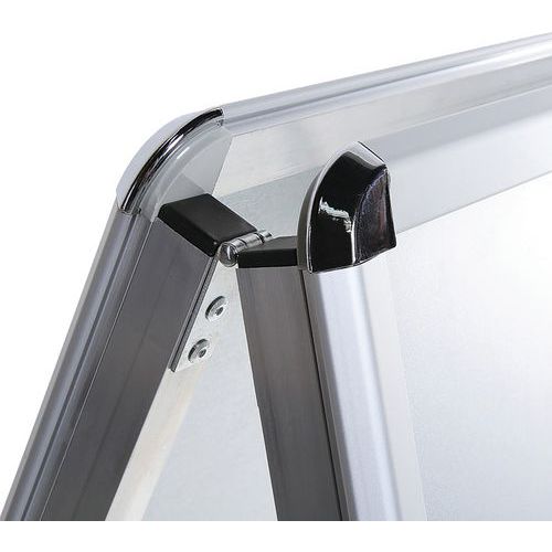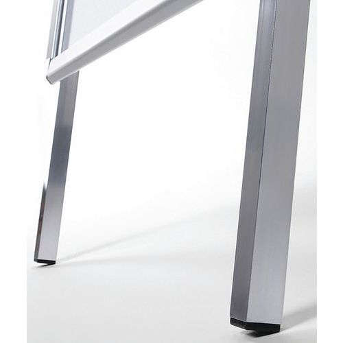 Cavalletto profilato con angoli arrotondati di 32 mm, visibilità e design accattivante. Stabile grazie agli inserti in plastica nelle gambe in alluminio. Cavalletto resistente agli urti grazie al retro in metallo inossidabile. Protezione delle affissioni con fogli antiriflesso resistenti ai raggi UV. Facile da spostare grazie alla forma a cavalletto pieghevole.