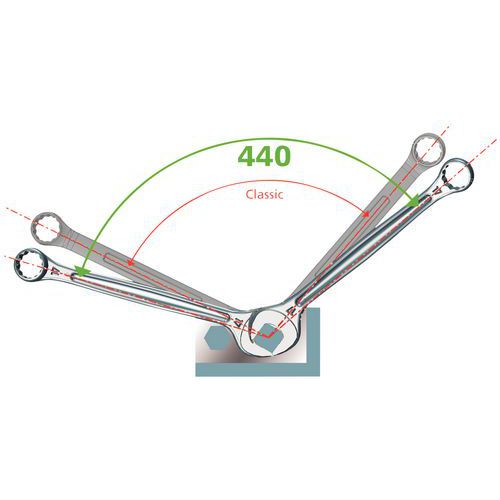 Profilo OGV® per garantire potenza di serraggio e protezione del dado. Teste sottili per facilitare l'accessibilità. Chiave mista con ripresa a 30°. Accesso facilitato ai dadi in serie o semi-incassati: disimpegno dell'occhiello inclinato a 15°. Manico ergonomico. Teste sottili per un migliore compromesso tra potenza e accessibilità. Maggior comfort: il manico a sezione variabile raddoppia la superficie d'appoggio sulla mano. Maggiore accessibilità grazie all'occhiello: disimpegno dell'occhiello (inclinazione a 15°) per accedere a dadi in serie o semi-incassati. Profilo OGV® : potenza e protezione. Serraggio più potente. Riduzione delle sollecitazioni grazie alle ampie superfici di contatto. Protezione del dado. Trascinamento sulle facce del dado: gli angoli non sono più sollecitati.