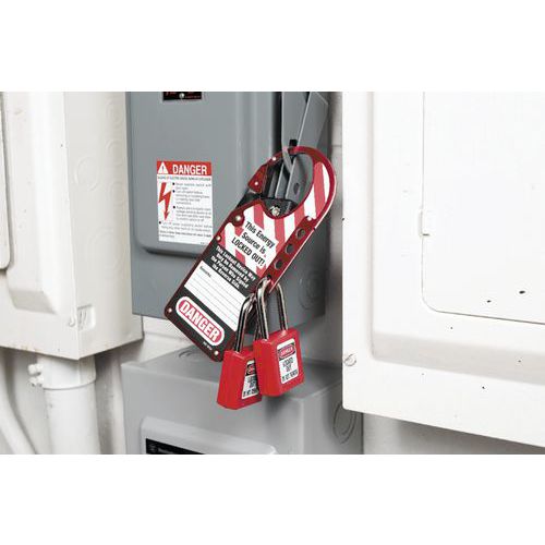 | Descrizione | Chiavistello di isolamento a scatto con etichetta, Colore: Rosso, Larghezza: 73 mm, N. di pezzi: 6 |