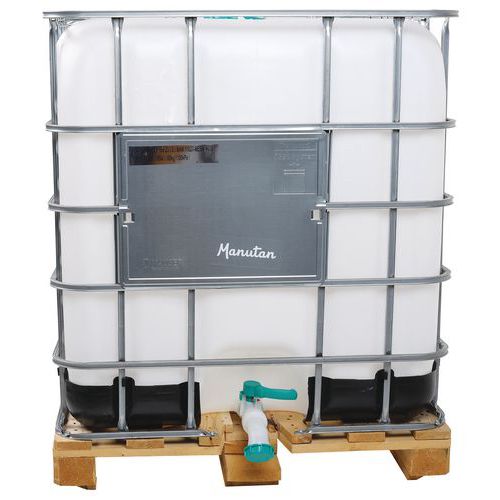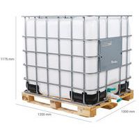 | Descrizione | Cisterna per trasporto cubica omologata 1000 L+ pallet in legno, Capacità: 1000 L, Altezza totale: 1175 mm |