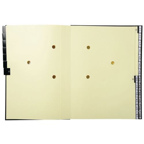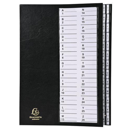 | Descrizione | Classificatore con linguette 26 scomparti Alfanumerici, N. di divisioni: 26, Colore: Nero, Materiale: Cartone |