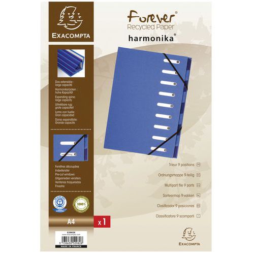 | Descrizione | Classificatore Harmonika Forever 9 scomparti, N. di divisioni: 9, Colore: Blu chiaro, Materiale: Cartone |