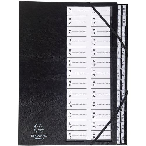 | Descrizione | Classificatore rigido Ordonator con segnalini alfabetici 26 scomparti, N. di divisioni: 26, Colore: Nero |