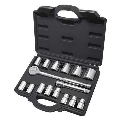 Composizione: 1 cricchetto, 1 prolunga, 14 bussole da 10 - 11 - 12 - 13 - 14 - 15 - 16 - 17 - 18 - 19 - 22 - 24 - 27 - 32 mm.