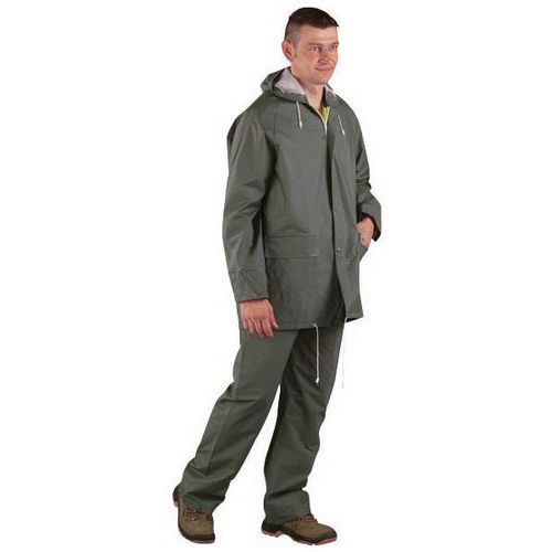 Completo giacca-pantaloni impermeabile a doppio rivestimento (PVC supporto cotone e poliestere). Giacca con dorso ventilato e cerniera lampo, patta a pressione e cordoncino di chiusura basso. Colletto a cappuccio: cappuccio fisso con cordoncino di chiusura. Maniche con chiusura antivento. Pantaloni con patta e bottone a pressione e chiusura (elastico in vita, a pressione sulle gambe). Spessore materiale esterno: 0,32 mm cucito e saldato.