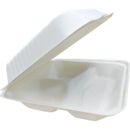 Contenitore per alimenti con coperchio incernierato. Resiste a una temperatura massima di 70 °C. Realizzato in polpa di cellulosa.