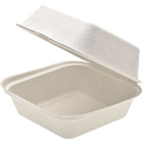 Contenitore per alimenti con coperchio incernierato. Resiste a una temperatura massima di 70 °C. Realizzato in polpa di cellulosa.