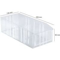 Contenitore robusto e suddivisibile, ideale per lo stoccaggio su scaffali o armadi. Apertura a becco anteriore, per una migliore visualizzazione del contenuto. Fondo e lati lisci. Buona resistenza agli acidi. Realizzato in Germania