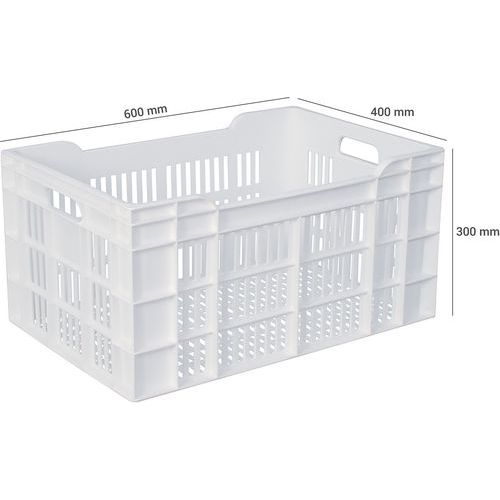 | Descrizione | Contenitore a norma europea con pareti e fondo traforati, Capacità: 60 L, Accatastabile: si |
