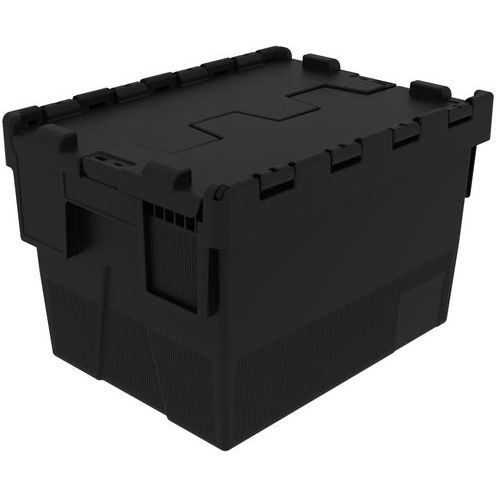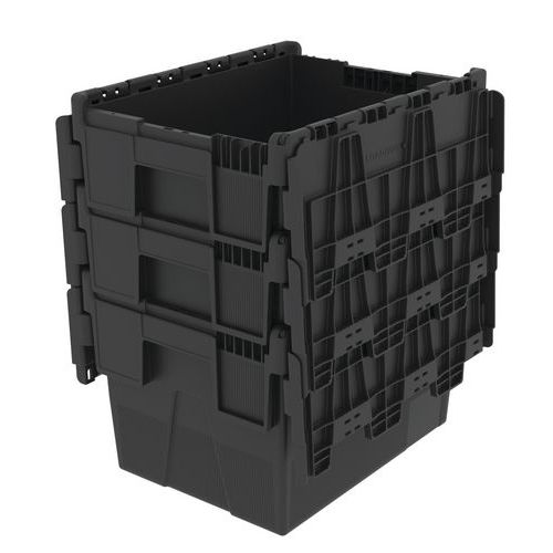 Contenitore da trasporto in plastica riciclata impilabile ed incastrabile per un ingombro ridotto. Contenitore a norma europea pallettizzabile e ad elevata stabilità di impilaggio. Resistente alle variazioni di temperatura. Pratico, il coperchio è rimovibile e ribaltabile. Chiusura antimanomissione con sigilli.