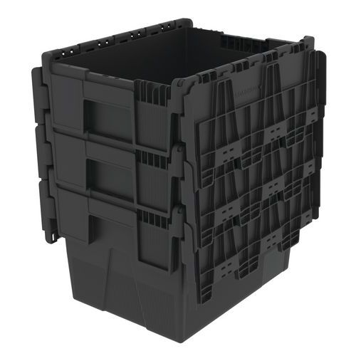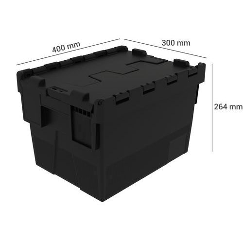 Contenitore da trasporto in plastica riciclata impilabile ed incastrabile per un ingombro ridotto. Contenitore a norma europea pallettizzabile e ad elevata stabilità di impilaggio. Resistente alle variazioni di temperatura. Pratico, il coperchio è rimovibile e ribaltabile. Chiusura antimanomissione con sigilli.