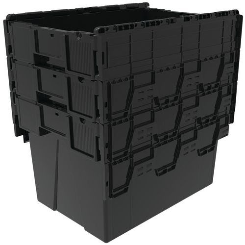 Contenitore da trasporto in plastica riciclata impilabile ed incastrabile per un ingombro ridotto. Contenitore a norma europea pallettizzabile e ad elevata stabilità di impilaggio. Resistente alle variazioni di temperatura. Pratico, il coperchio è rimovibile e ribaltabile. Chiusura antimanomissione con sigilli.
