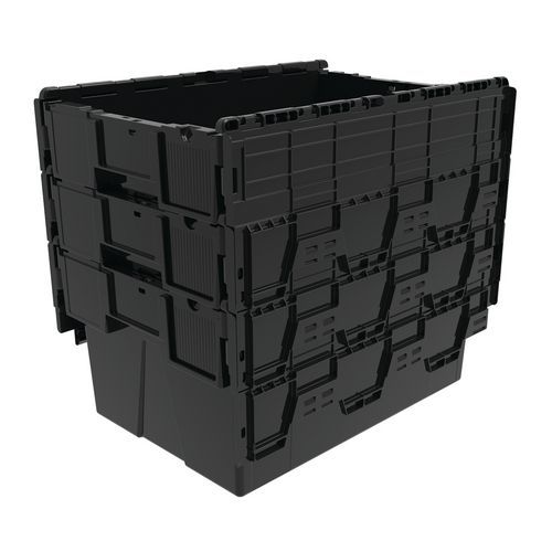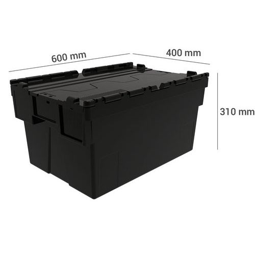 Contenitore da trasporto in plastica riciclata impilabile ed incastrabile per un ingombro ridotto. Contenitore a norma europea pallettizzabile e ad elevata stabilità di impilaggio. Resistente alle variazioni di temperatura. Pratico, il coperchio è rimovibile e ribaltabile. Chiusura antimanomissione con sigilli.