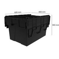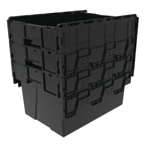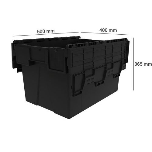 Contenitore da trasporto in plastica riciclata impilabile ed incastrabile per un ingombro ridotto. Contenitore a norma europea pallettizzabile e ad elevata stabilità di impilaggio. Resistente alle variazioni di temperatura. Pratico, il coperchio è rimovibile e ribaltabile. Chiusura antimanomissione con sigilli.
