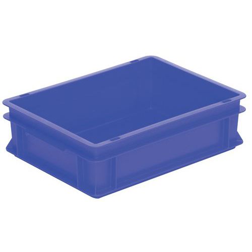 Contenitore impilabile a norma europea. Dotato di pareti piene, fondo pieno e manici a conchiglia.
