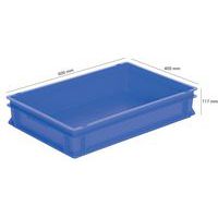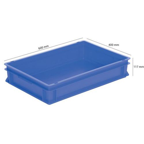 Contenitore impilabile a norma europea. Dotato di pareti piene, fondo pieno e manici a conchiglia.