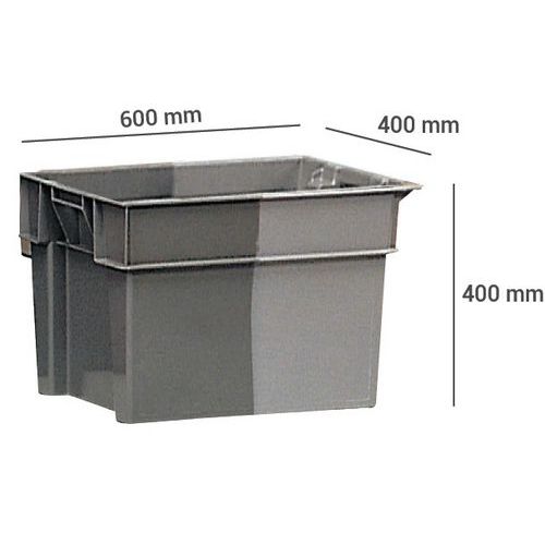 Impilabile al 60 % per una maggiore risparmio di spazio a vuoto. Comodo da spostare grazie alle grandi maniglie ergonomiche. Compatibile con tutti i i tipi di trasportatore grazie al fondo liscio. Posizione impilaggio/incastro facili da identificare grazie alla struttura bicolore.