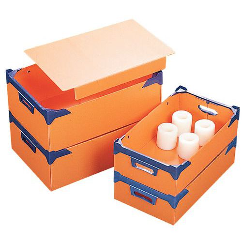Grande robustezza grazie ai lati minori rinforzati da profilati di plastica. Spostamento facilitato dalle impugnature e dalle guide per le forche. Montaggio rapido grazie alle linee di piegatura preformate.