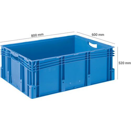 Contenitore impilabile molto robusto grazie al doppio fondo. Movimentazione semplice grazie alle impugnature ergonomiche aperte. Grande stabilità di impilaggio grazie ai bordi rinforzati. Contenitore con resistenza elevata agli sbalzi di temperatura.