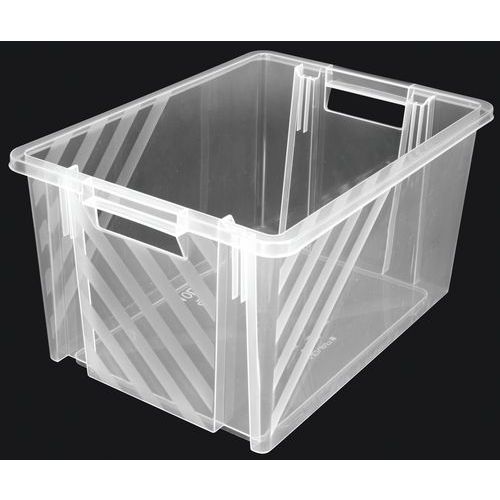 Contenitore incastrabile con impugnature aperte per una facile movimentazione.