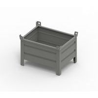 I contenitori in metallo sono realizzati in una solida lamiera lavorata e sagomata che rende la struttura del cassone in metallo stabile, robusta e resistente ai carichi più diversi. Disponibili in versione con quattro pareti lisce oppure uno sportello frontale liscio o in rete metallica. Su piedi, disponibile in versione normale o rinforzata. Forconabili e impilabili. Realizzato secondo elevati standard qualitativi di saldatura ISO 3834 2006. Realizzato in Italia Carico statico max. (kg) : 800 Carico max. (kg) : 800
