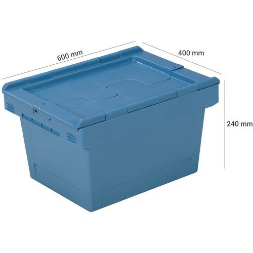 Impilabile e incastrabile per risparmiare spazio! Dimensioni normalizzate e conformi alle norme europee, ideali per il trasporto. Riduzione degli imballaggi grazie al coperchio ribaltabile integrato. Pareti interne lisce per sfruttare al meglio il volume. Disponibile in 4 formati.